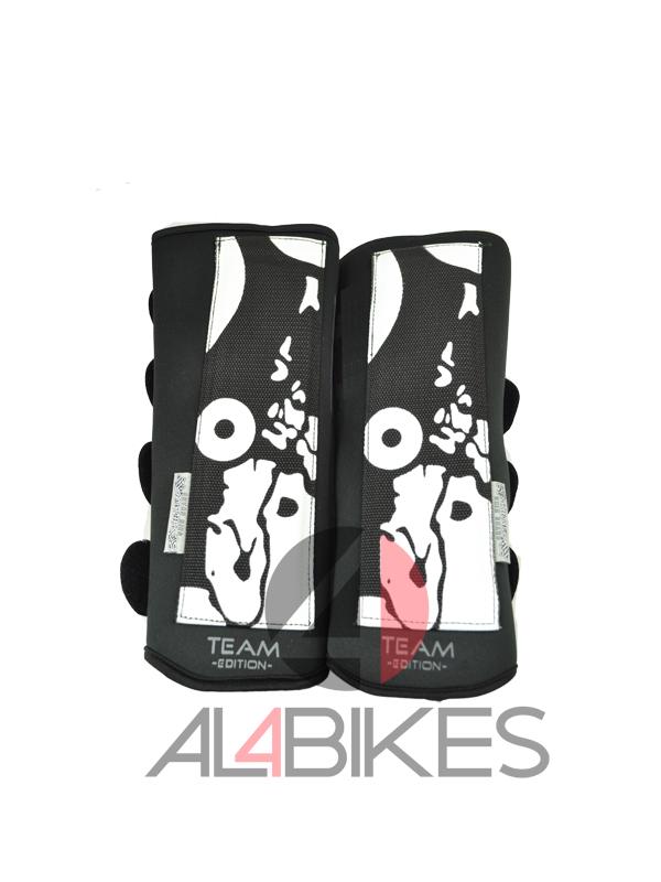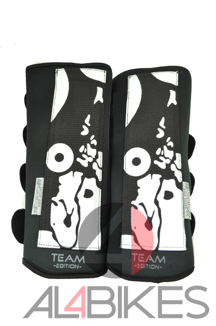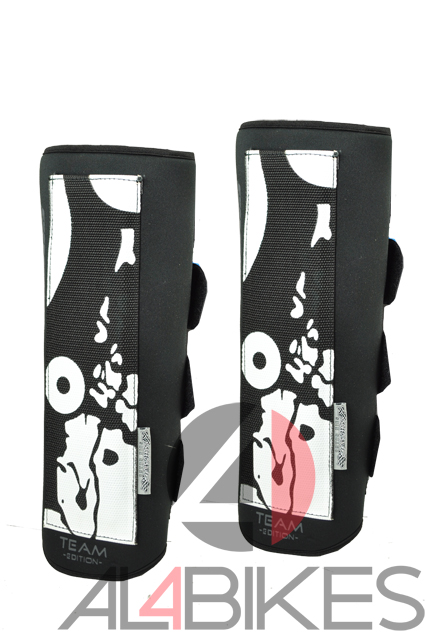 -Guards positioned on the outside right behind the logo composed of a rigid plastic and an absorbent neoprene.