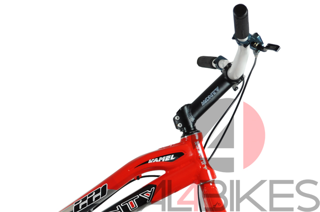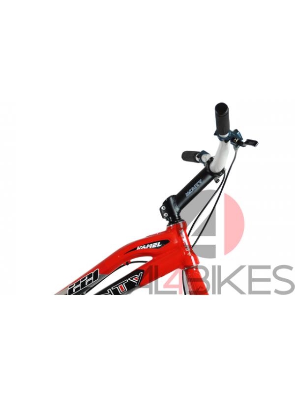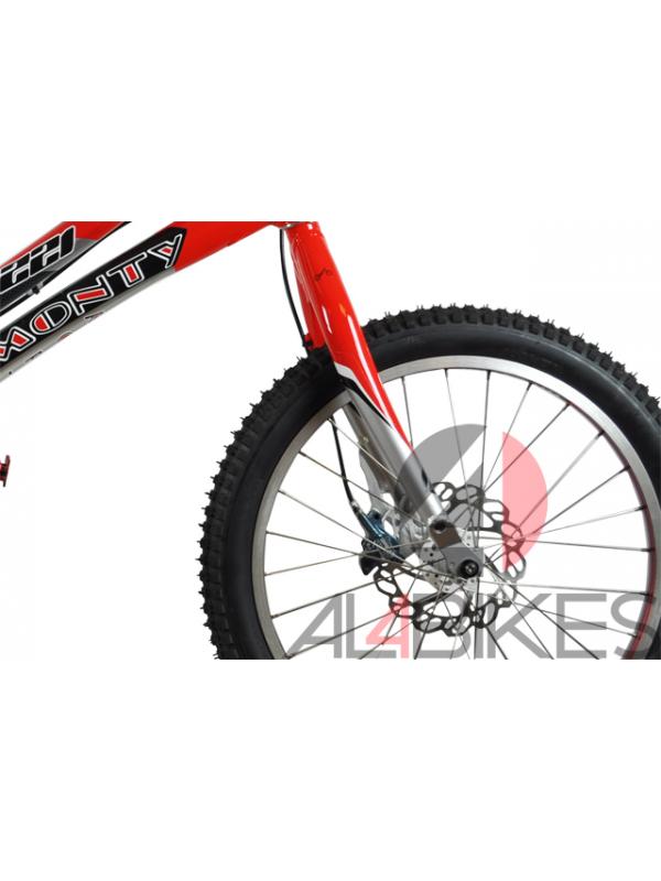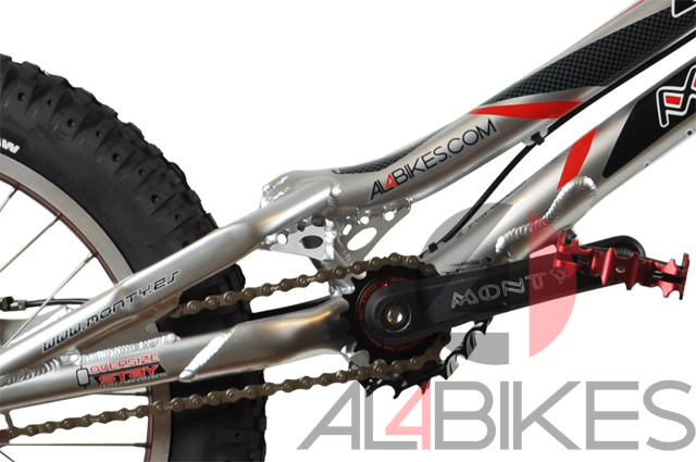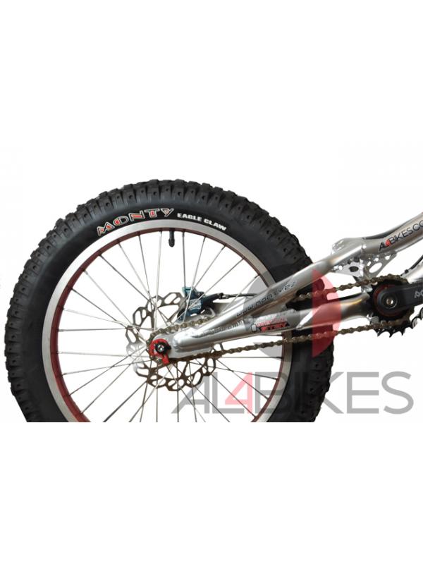 Llanta delantera: Monty 20'' 30mm 28H Roja anodizado / Llanta trasera: Monty 19'' 40mm 32H roja mono capa.
