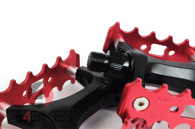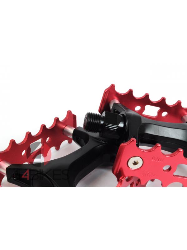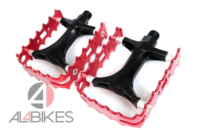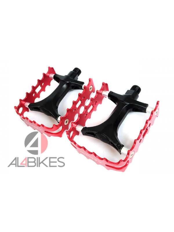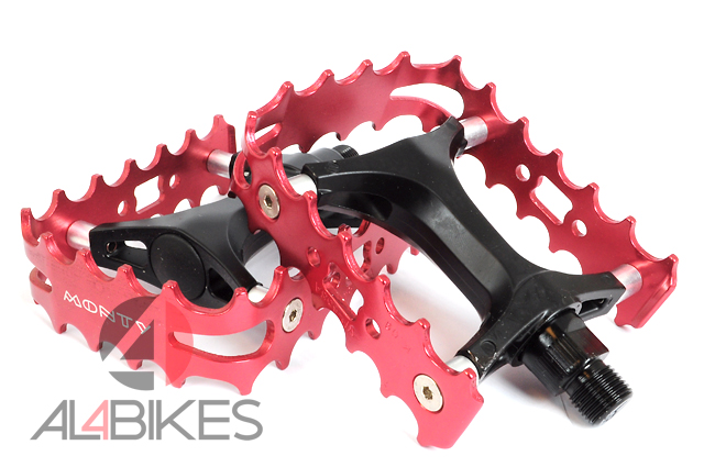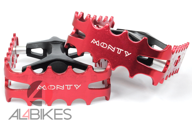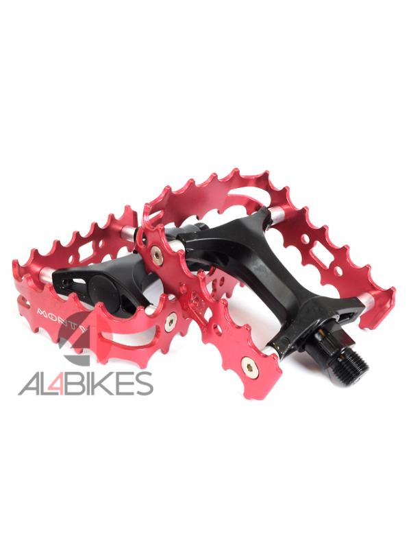 Pedales monty con herradura de aluminio en color rojo.