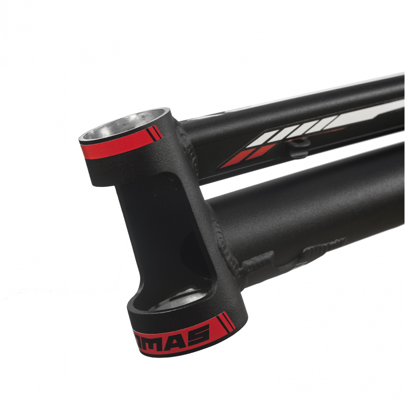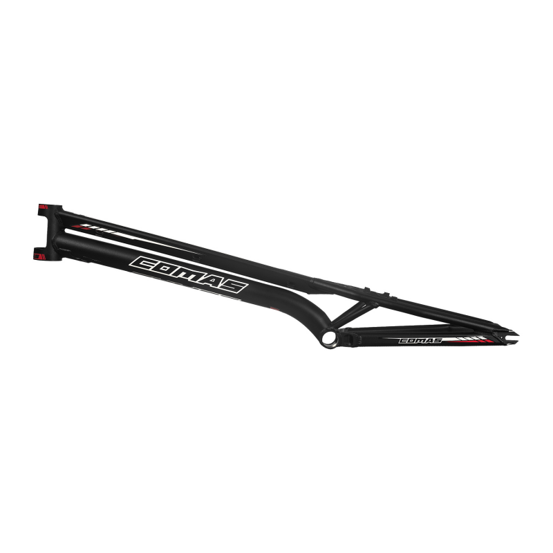 - Cuadro de trial de 26”con diseño y geometría exclusiva 100% COMAS y tubo de dirección cónico aligerado de 1-1/8” a 1.5”